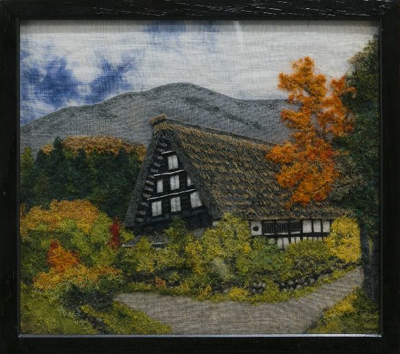 『布綿絵による合掌造りの里の秋』